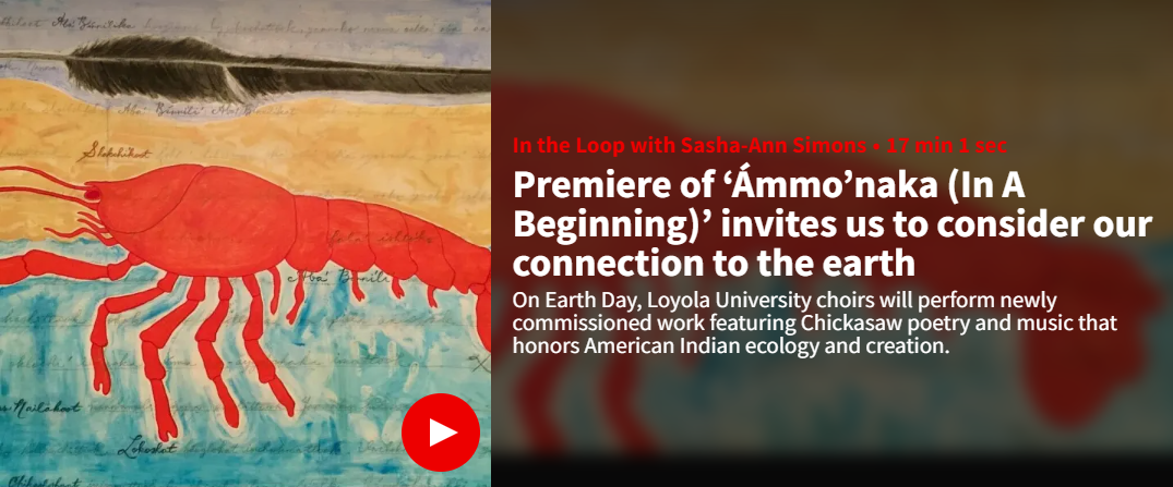 Ámmo'naka̱ (In a Beginning) is a new work composed for the Loyola Choirs and The EcoVoice Project by Jerod Impichchaachaaha' Tate. With new poetry entirely conceived in the Chickasaw language by Lokosh Hinson, Ámmo'naka̱ combines Western technique and Chickasaw folk music to explore American Indian ecology and creation. Additional works by Andrew Balfour, Brent Michael Davids, and Sherryl Sewepagaham will round out the program.